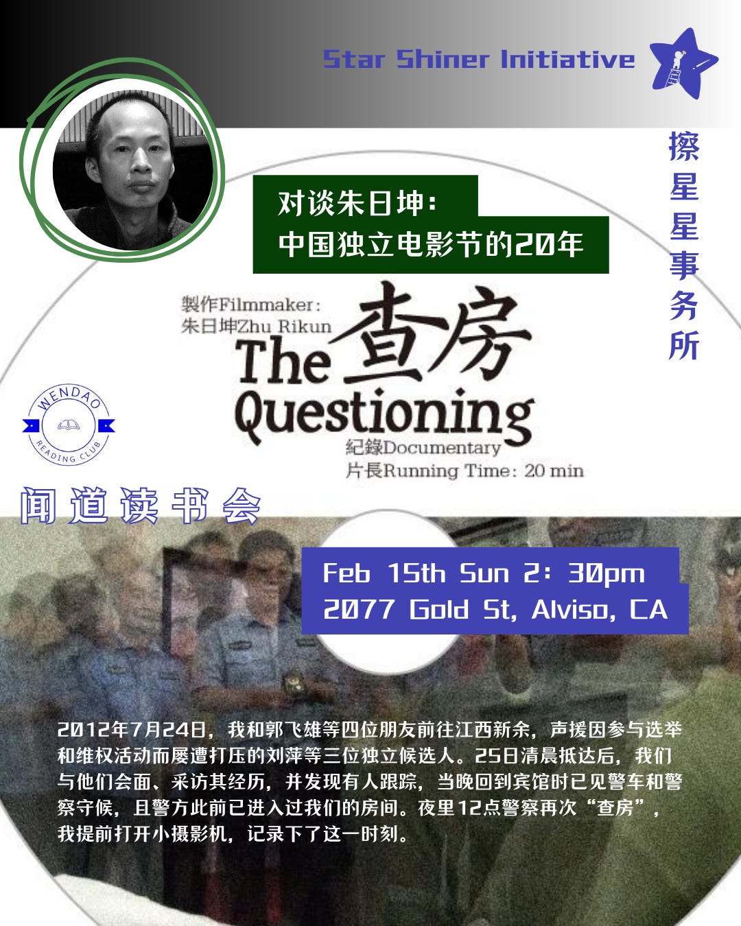 擦星星事务所 × 闻道读书会,邀请湾区朋友参加一场特别的纪录片放映与对谈活动。本次活动嘉宾为中国独立电影导演、策展人朱日坤。